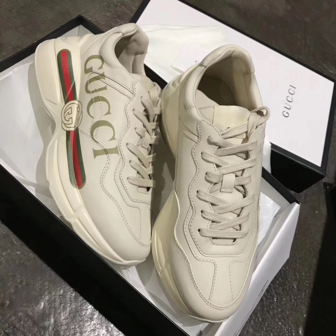 Leather sneakers feature a wide-bottomed, wide-body silhouette with a vintage Gucci logo, and the design is influenced by the 1980s print.